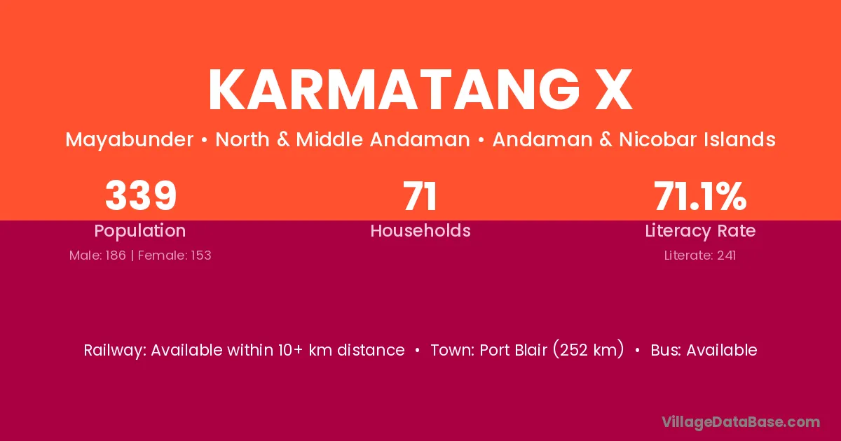 Port Blair (252 km) is the nearest town to Karmatang X village for major economic activities and is located approximately 252 km away.