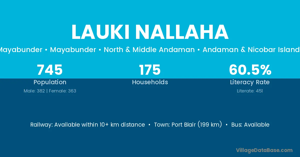 Port Blair (199 km) is the nearest town to Lauki Nallaha village for major economic activities and is located approximately 199 km away.
