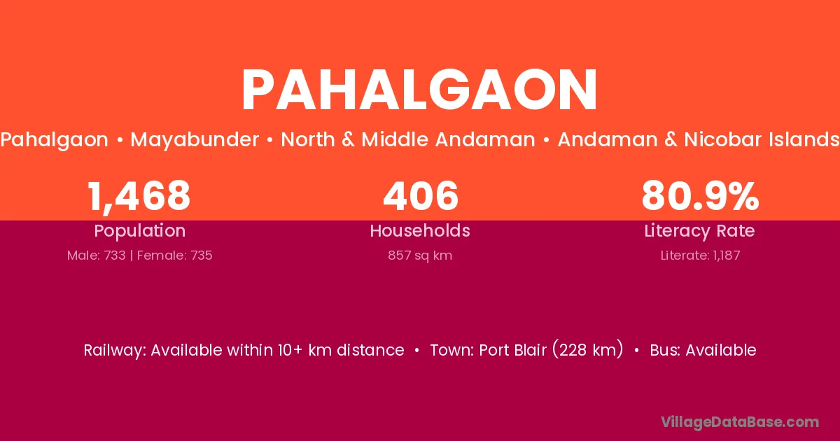 Port Blair (228 km) is the nearest town to Pahalgaon village for major economic activities and is located approximately 228 km away.