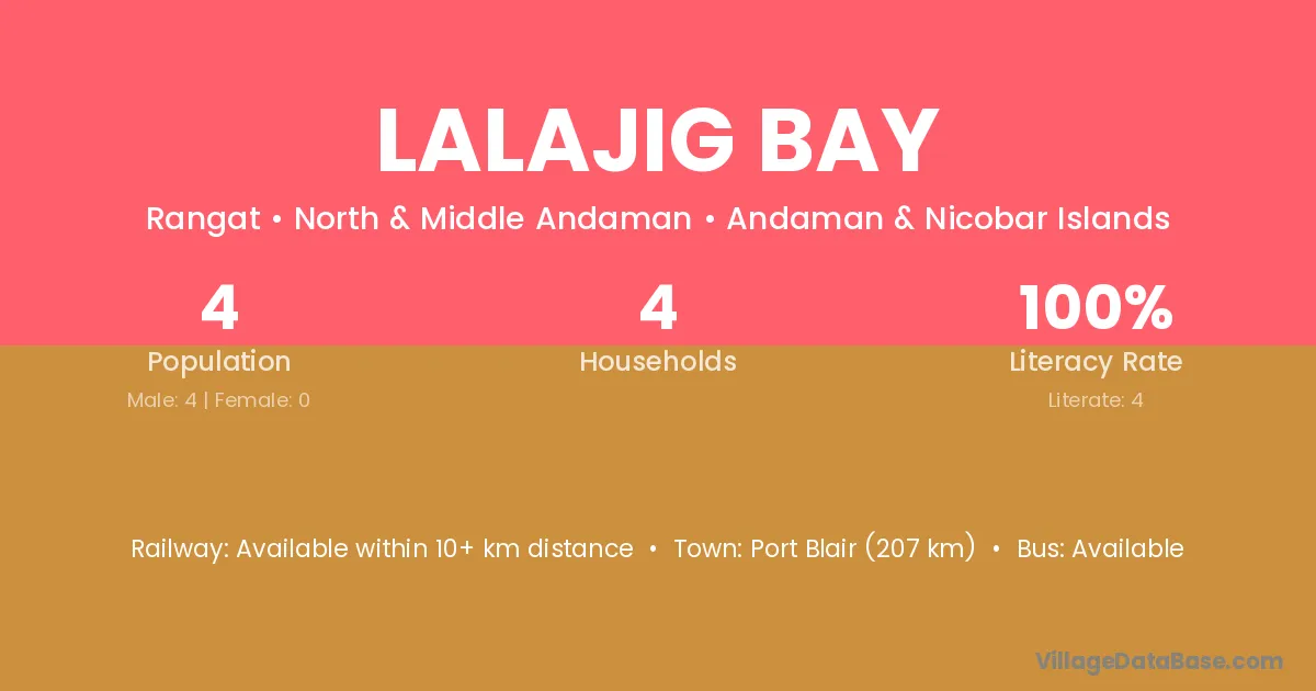 Port Blair (207 km) is the nearest town to Lalajig Bay village for major economic activities and is located approximately 207 km away.