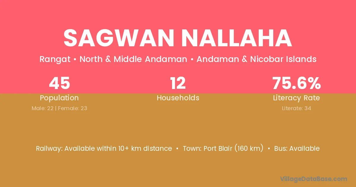 Port Blair (160 km) is the nearest town to Sagwan Nallaha village for major economic activities and is located approximately 160 km away.