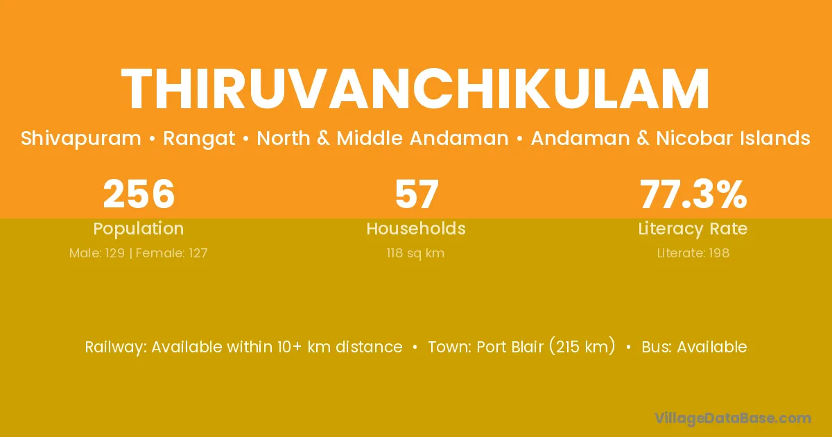 Port Blair (215 km) is the nearest town to Thiruvanchikulam village for major economic activities and is located approximately 215 km away.