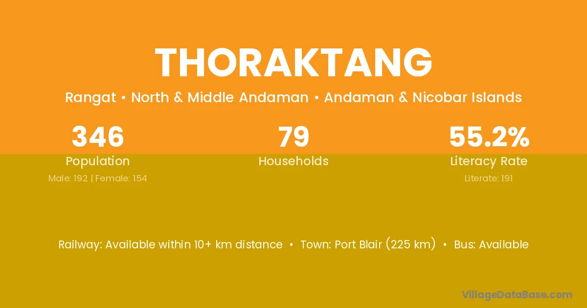 Port Blair (225 km) is the nearest town to Thoraktang village for major economic activities and is located approximately 225 km away.