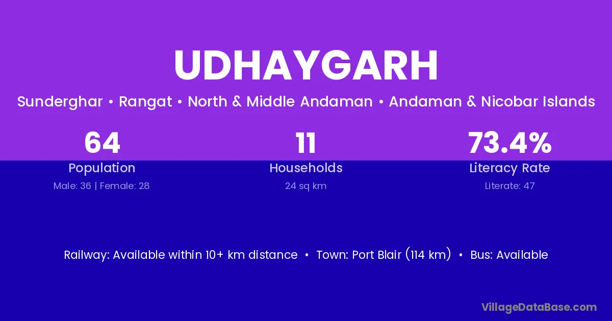Port Blair (114 km) is the nearest town to Udhaygarh village for major economic activities and is located approximately 114 km away.