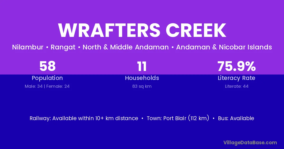 Port Blair (112 km) is the nearest town to Wrafters Creek village for major economic activities and is located approximately 112 km away.