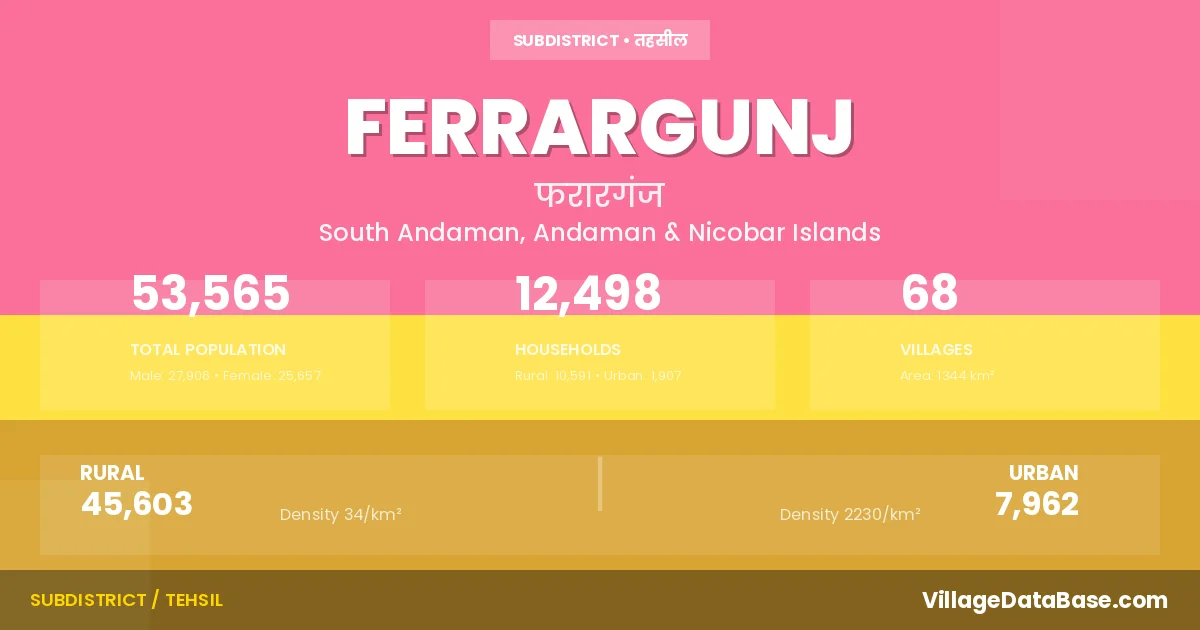 Ferrargunj is a town and Tehsil in the South Andaman district of the Andaman & Nicobar Islands. In India, a Tehsil is a subdivision of a district responsible for the administration and revenue collection of a specific area within the district. Tehsils play a crucial role in the local governance structure, contributing significantly to the development and administration of their communities.