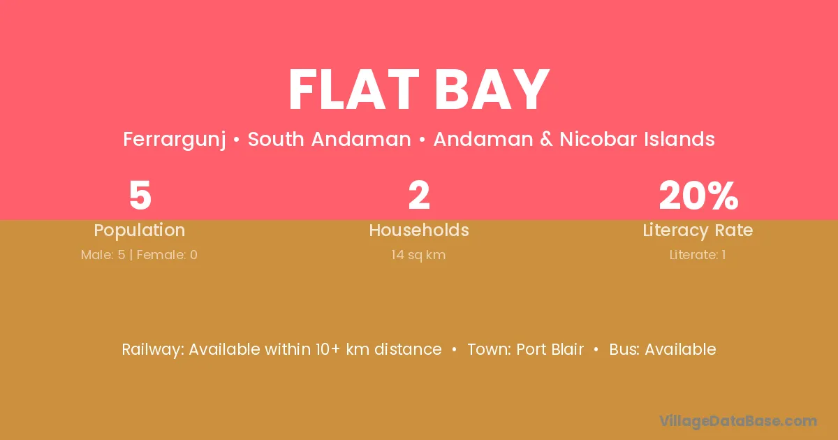 The literacy rate of Flat Bay village is 20.00%. Male literacy stands at 20.00% and female literacy at 0%.