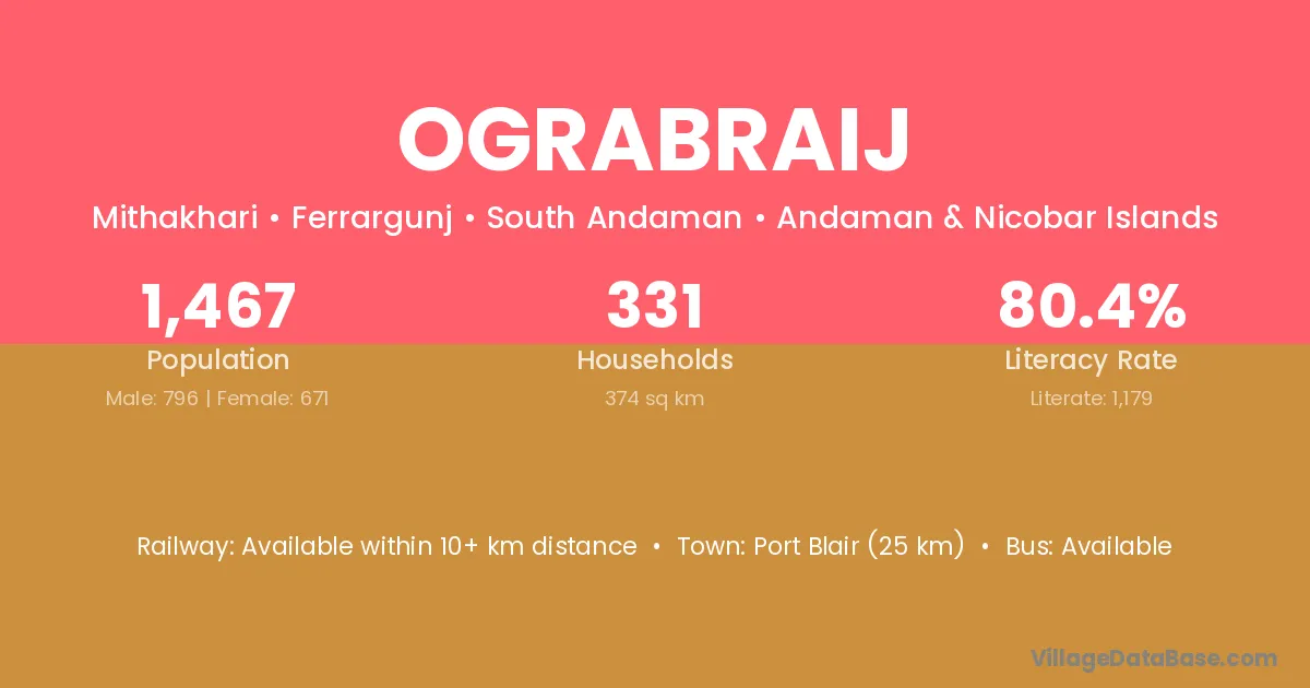 Port Blair (25 km) is the nearest town to Ograbraij village for major economic activities and is located approximately 25 km away.