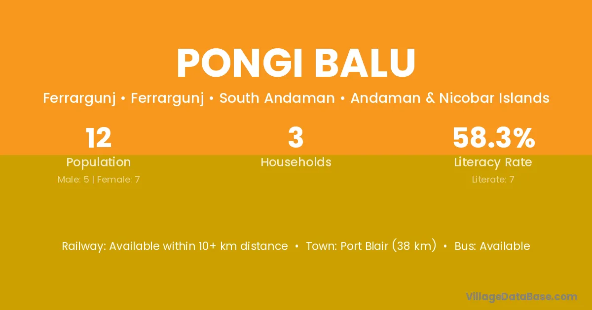 Port Blair (38 km) is the nearest town to Pongi Balu village for major economic activities and is located approximately 38 km away.