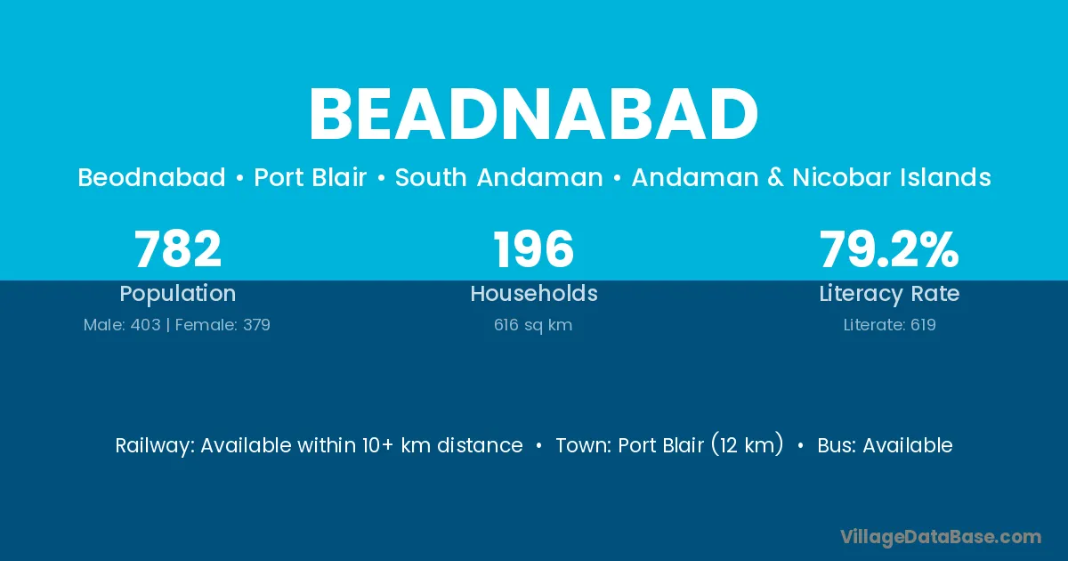 Port Blair (12 km) is the nearest town to Beadnabad village for major economic activities and is located approximately 12 km away.