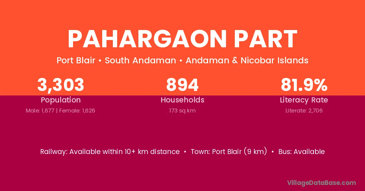 Port Blair (9 km) is the nearest town to Pahargaon Part village for major economic activities and is located approximately 9 km away.