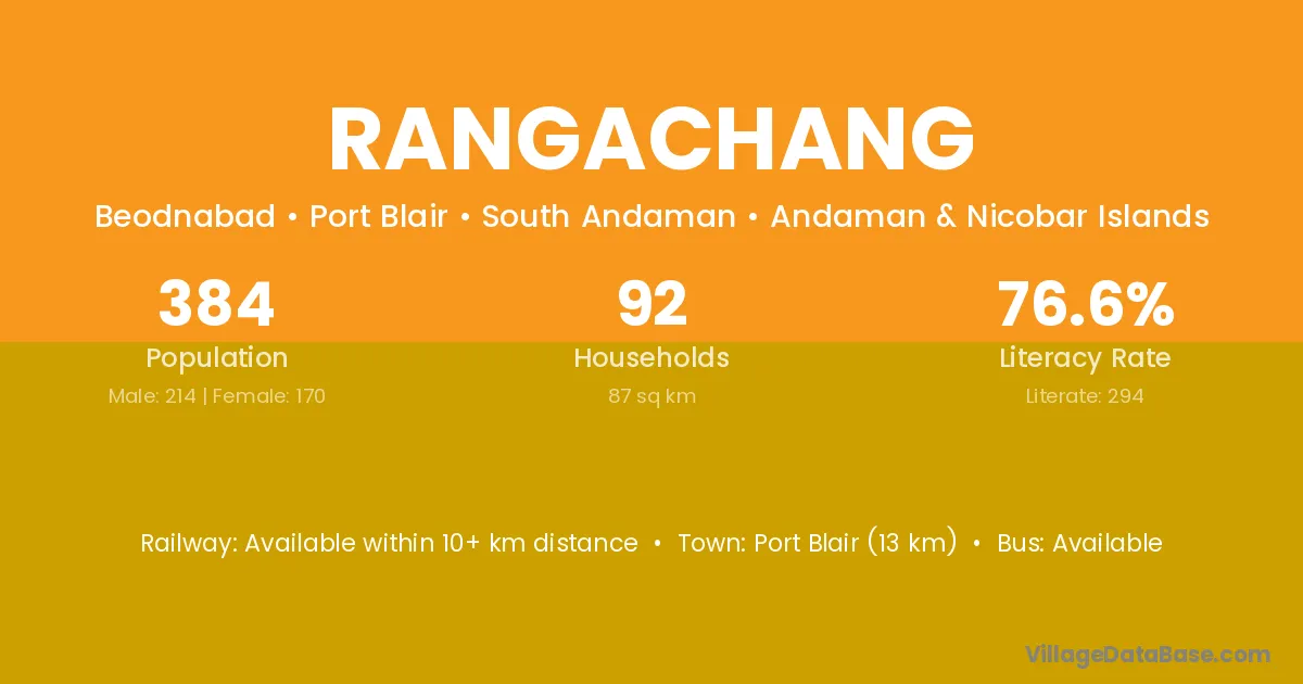 Port Blair (13 km) is the nearest town to Rangachang village for major economic activities and is located approximately 13 km away.