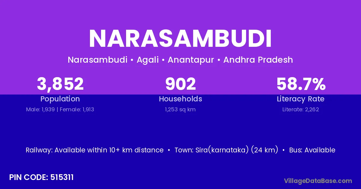 Sira(karnataka) (24 km) is the nearest town to Narasambudi village for major economic activities and is located approximately 24 km away.