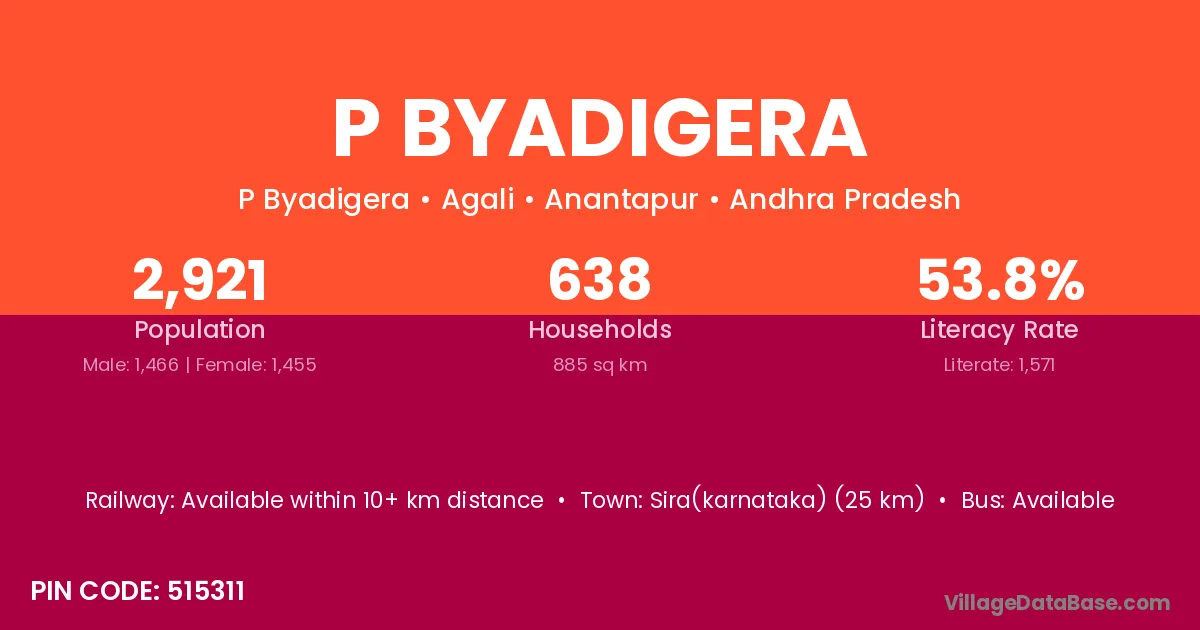 Sira(karnataka) (25 km) is the nearest town to P Byadigera village for major economic activities and is located approximately 25 km away.