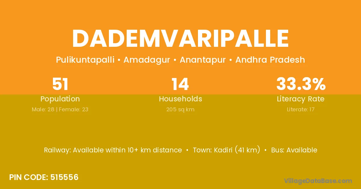 Kadiri (41 km) is the nearest town to Dademvaripalle village for major economic activities and is located approximately 41 km away.