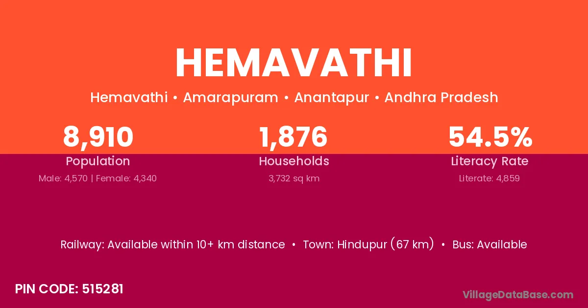 Hindupur (67 km) is the nearest town to Hemavathi village for major economic activities and is located approximately 67 km away.