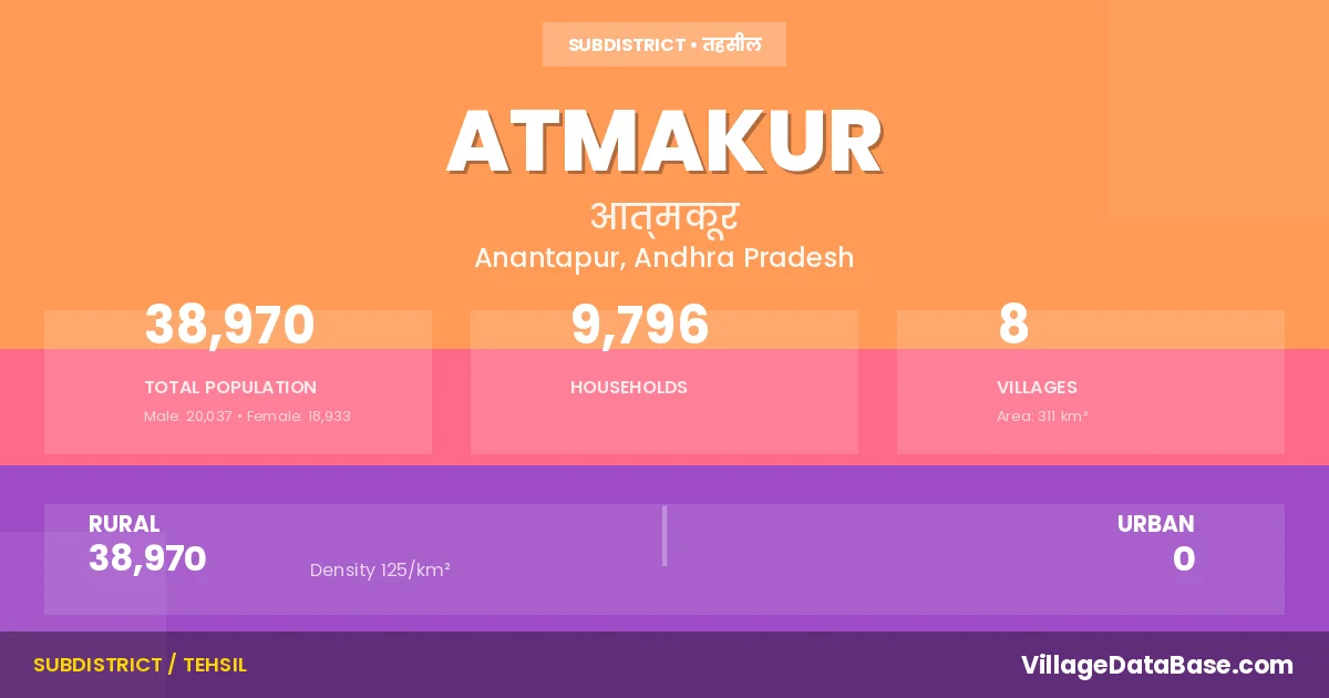 According to the 2011 census The total area of Atmakur Mandal is 311 km², with a population of 38970 people. The population density is 125 inhabitants per square kilometre, and there are approximately 9796 houses in the sub district.