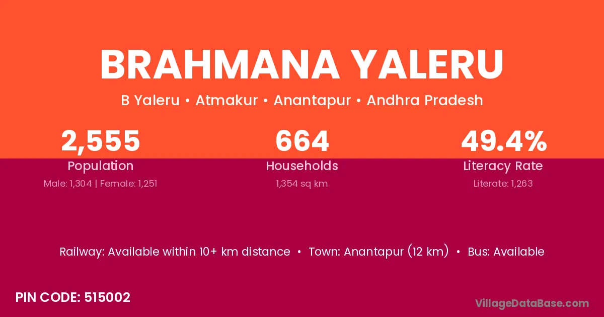 Anantapur (12 km) is the nearest town to Brahmana Yaleru village for major economic activities and is located approximately 12 km away.