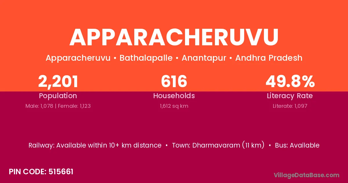 Apparacheruvu village has a total population of 2,201 people, of which 1,078 are males and 1,123 are females.