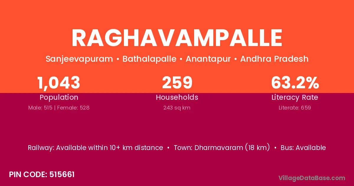 Raghavampalle village has a total population of 1,043 people, of which 515 are males and 528 are females.