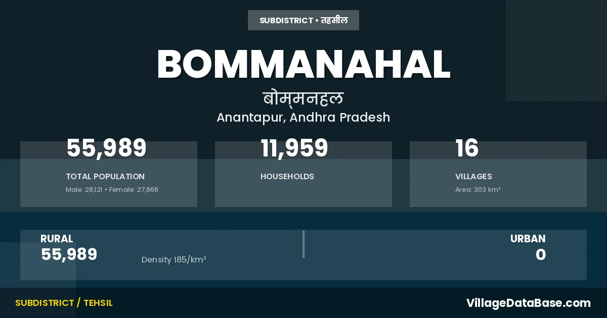 According to the 2011 census The total area of Bommanahal Mandal is 303 km², with a population of 55989 people. The population density is 185 inhabitants per square kilometre, and there are approximately 11959 houses in the sub district.