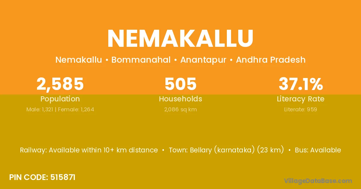 Bellary (karnataka) (23 km) is the nearest town to Nemakallu village for major economic activities and is located approximately 23 km away.