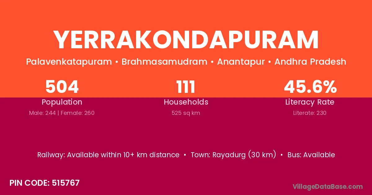 Yerrakondapuram village has a total population of 504 people, of which 244 are males and 260 are females.