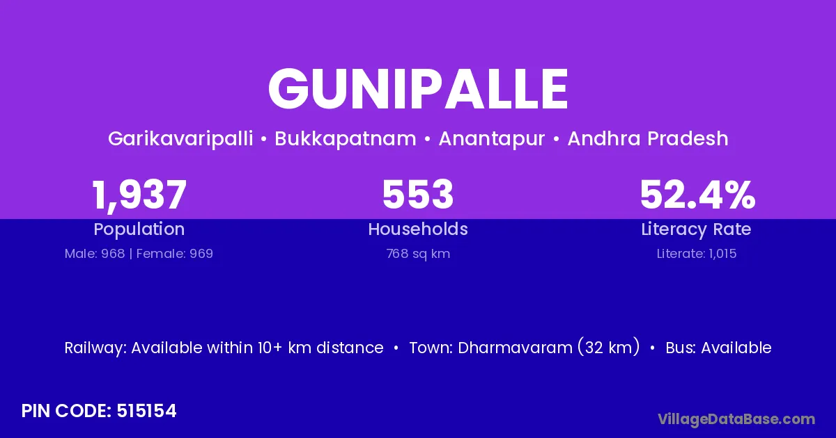 Dharmavaram (32 km) is the nearest town to Gunipalle village for major economic activities and is located approximately 32 km away.