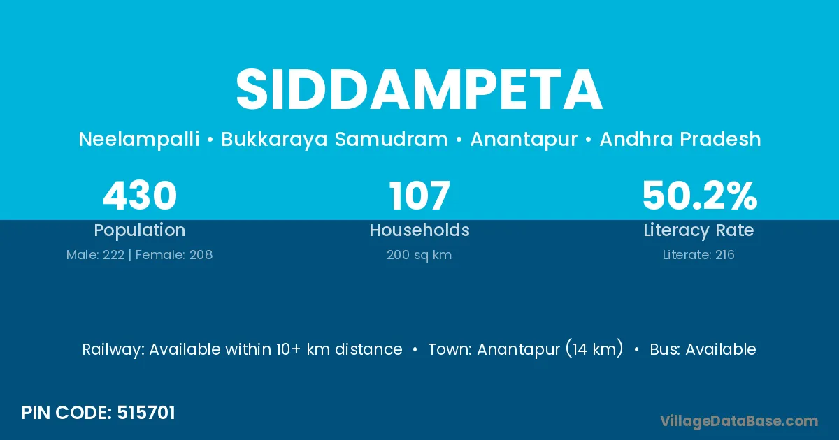 Siddampeta village has a total population of 430 people, of which 222 are males and 208 are females.