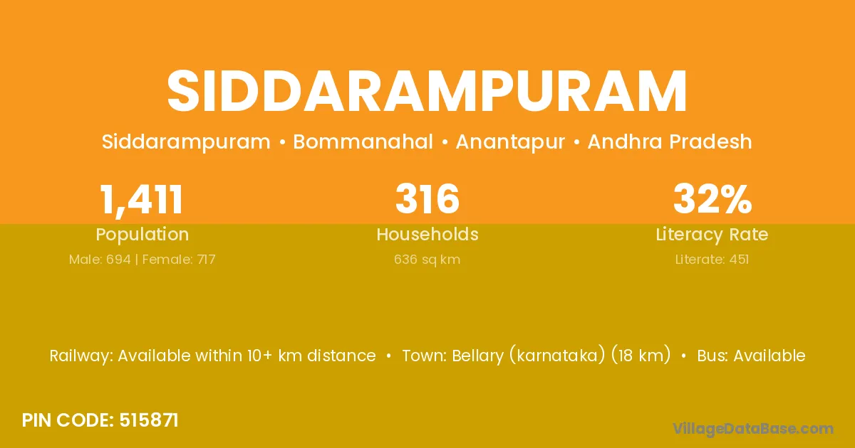 Anantapur (9 km) is the nearest town to Siddarampuram village for major economic activities and is located approximately 9 km away.