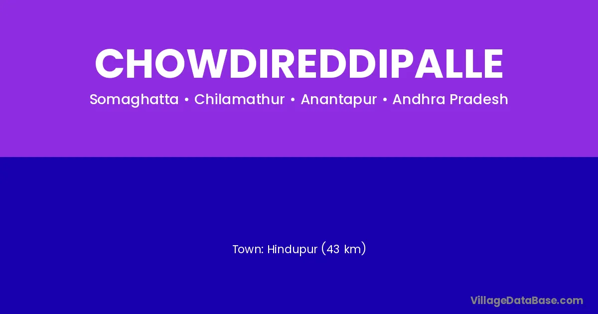 Hindupur (43 km) is the nearest town to Chowdireddipalle village for major economic activities and is located approximately 43 km away.