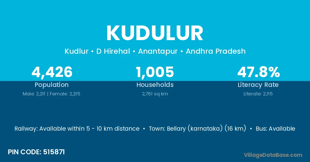 Kudulur village has a total population of 4,426 people, of which 2,211 are males and 2,215 are females.