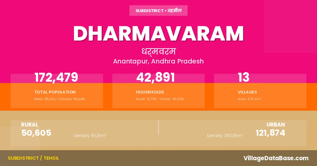 According to the 2011 census The total area of Dharmavaram Mandal is 375 km², with a population of 172479 people. The population density is 460 inhabitants per square kilometre, and there are approximately 42891 houses in the sub district.