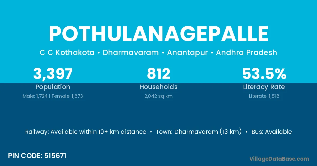 Dharmavaram (13 km) is the nearest town to Pothulanagepalle village for major economic activities and is located approximately 13 km away.