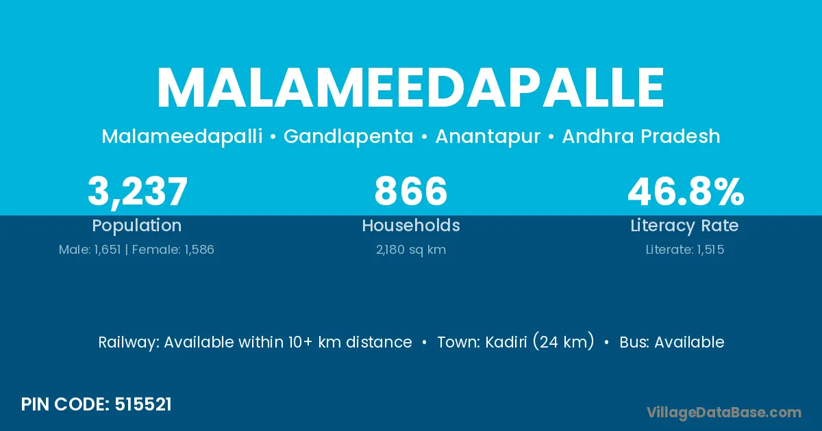 Kadiri (24 km) is the nearest town to Malameedapalle village for major economic activities and is located approximately 24 km away.
