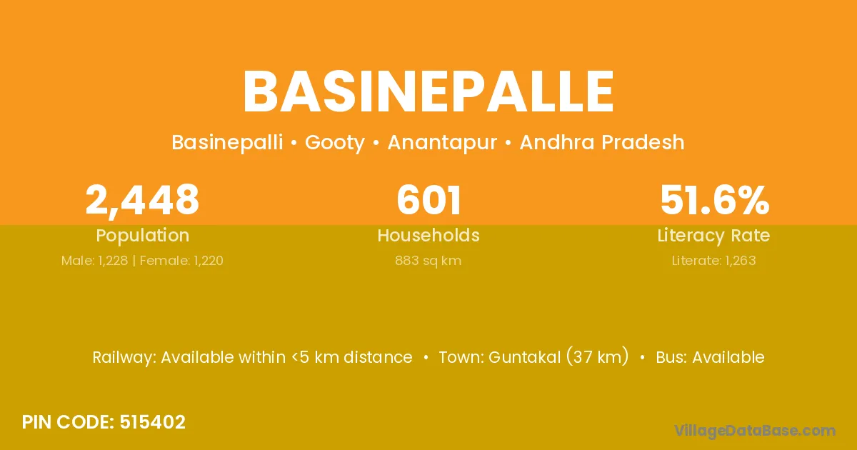 Guntakal (37 km) is the nearest town to Basinepalle village for major economic activities and is located approximately 37 km away.