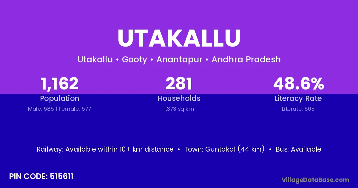 Guntakal (44 km) is the nearest town to Utakallu village for major economic activities and is located approximately 44 km away.