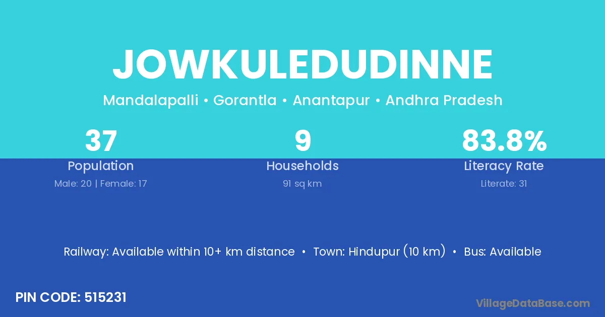 Jowkuledudinne village has a total population of 37 people, of which 20 are males and 17 are females.
