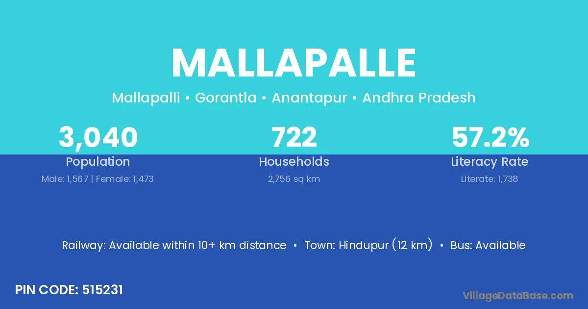 Hindupur (12 km) is the nearest town to Mallapalle village for major economic activities and is located approximately 12 km away.