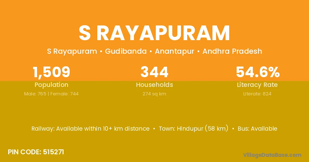 Hindupur (58 km) is the nearest town to S Rayapuram village for major economic activities and is located approximately 58 km away.
