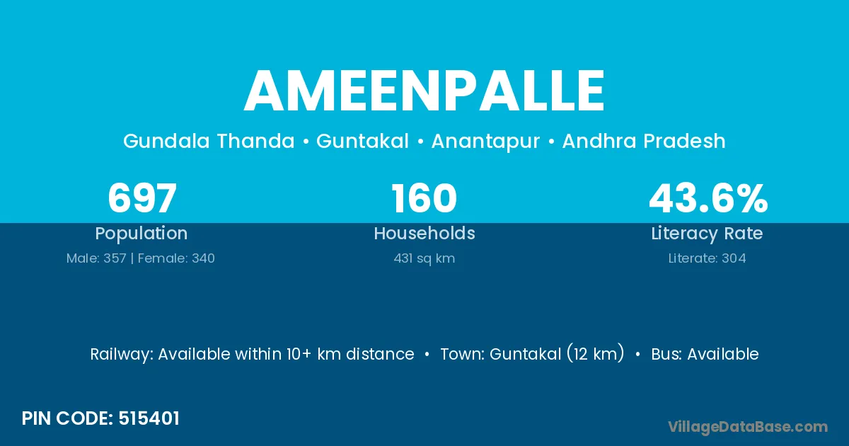 Guntakal (12 km) is the nearest town to Ameenpalle village for major economic activities and is located approximately 12 km away.
