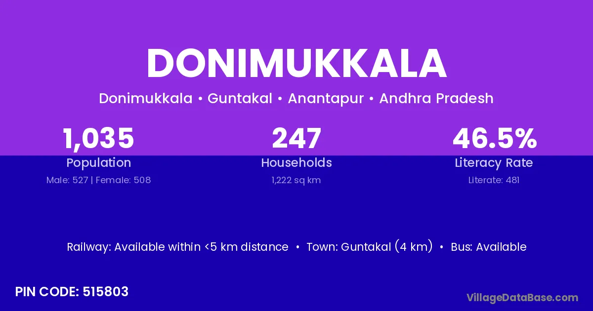 Guntakal (4 km) is the nearest town to Donimukkala village for major economic activities and is located approximately 4 km away.