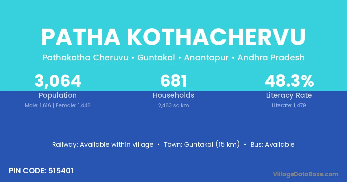 Guntakal (15 km) is the nearest town to Patha Kothachervu village for major economic activities and is located approximately 15 km away.