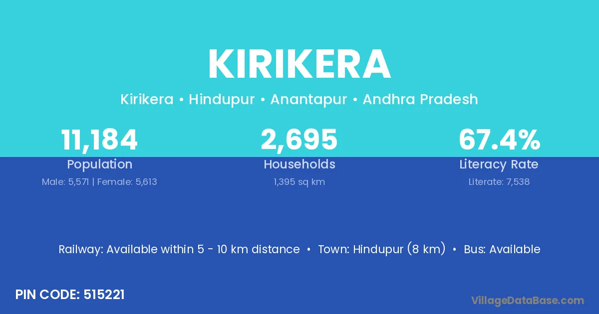 Hindupur (8 km) is the nearest town to Kirikera village for major economic activities and is located approximately 8 km away.