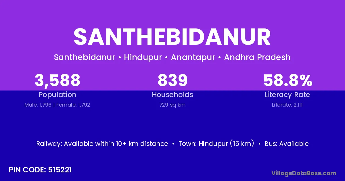 Hindupur (15 km) is the nearest town to Santhebidanur village for major economic activities and is located approximately 15 km away.