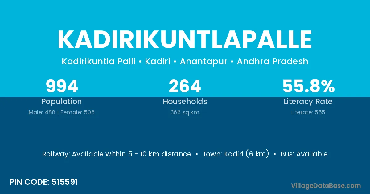 Kadiri (6 km) is the nearest town to Kadirikuntlapalle village for major economic activities and is located approximately 6 km away.