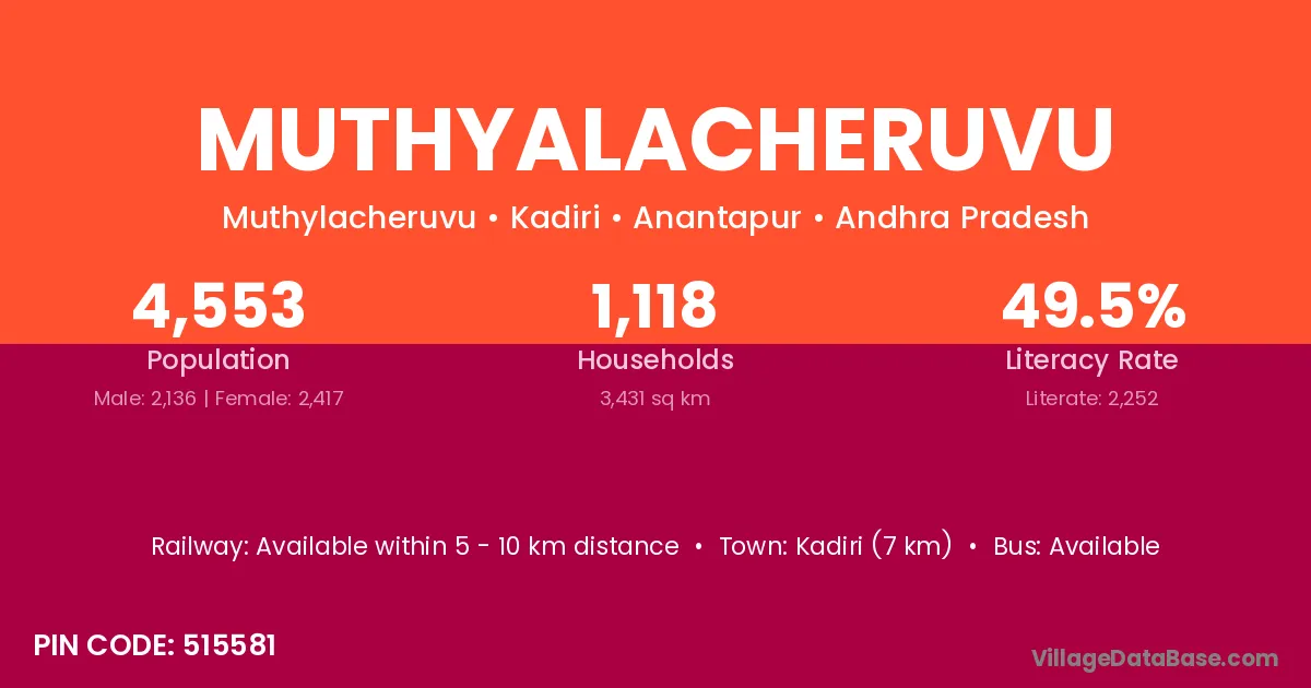 Kadiri (7 km) is the nearest town to Muthyalacheruvu village for major economic activities and is located approximately 7 km away.