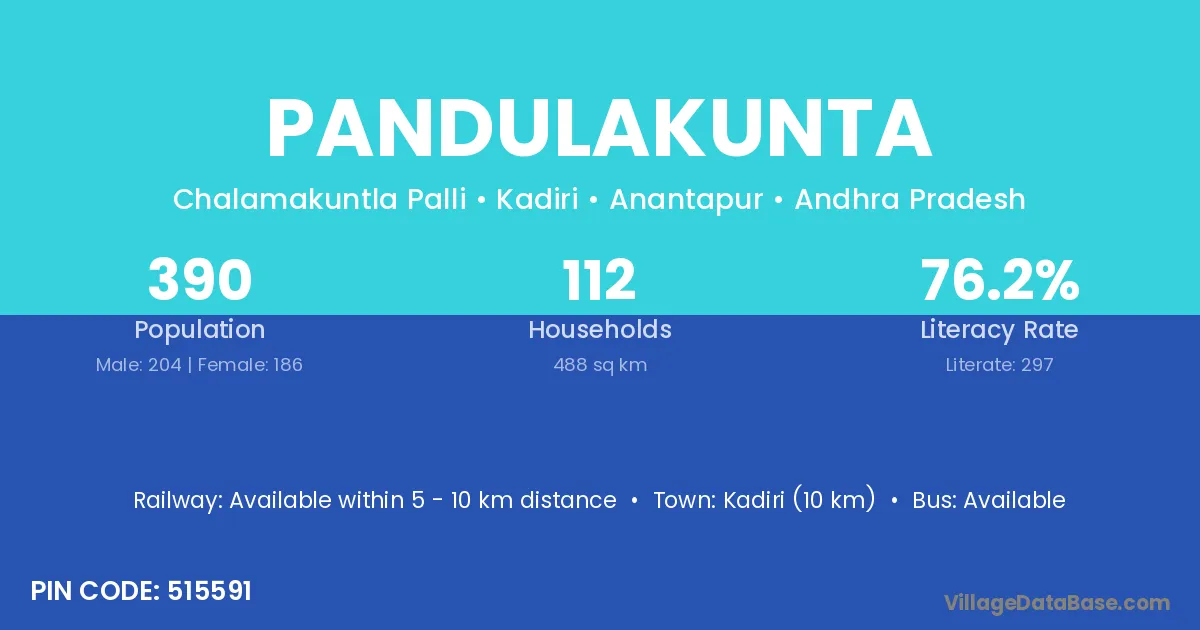Kadiri (10 km) is the nearest town to Pandulakunta village for major economic activities and is located approximately 10 km away.