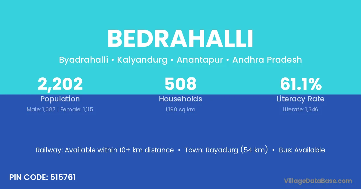 Bedrahalli village has a total population of 2,202 people, of which 1,087 are males and 1,115 are females.