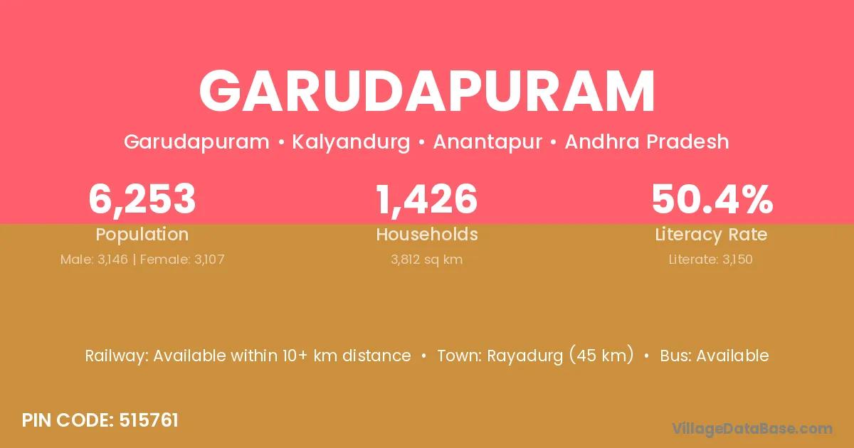 Rayadurg (45 km) is the nearest town to Garudapuram village for major economic activities and is located approximately 45 km away.